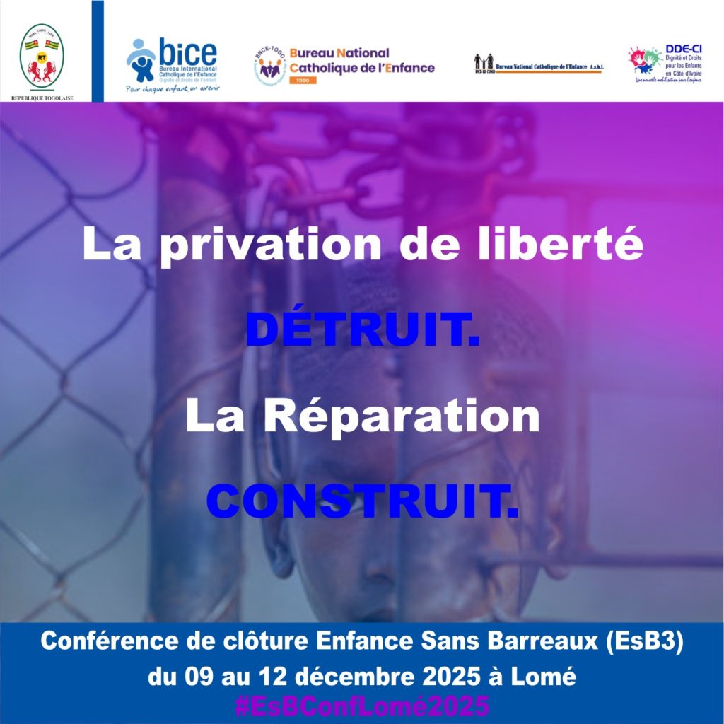 Général Justice réparatrice et réinsertion durable des enfants en conflit avec la loi en Afrique Updated on décembre 9, 2025 by BNCE Togo https://bice.org/fr/conference-de-cloture-du-programme-enfance-sans-barreaux-3-esb3